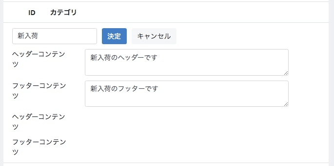 カテゴリーを新規で作成する場合は、カテゴリー名とヘッダーコンテンツ、フッターコンテンツを入力し、[新規作成]ボタンをクリックします。