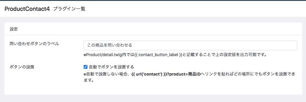 | ボタンの設置 | 自動でボタンを設置する場合はチェックを入れます。 デザインを変えたり配置を変えたい場合はチェックを外し、{{ url(‘contact’) }}?product=商品IDへリンクを貼ります。 |