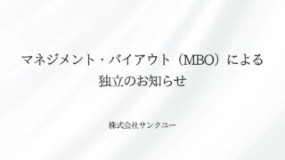 この度、株式会社サンクユー(本社:東京都品川区、代表取締役:堀川治)は、2025年9月16日をもちまして、株式会社バイタリフィ(本社:東京都渋谷区)が保有する当社の全株式を、当社代表取締役である堀川治が取得するマネジメント・バイアウト(MB...